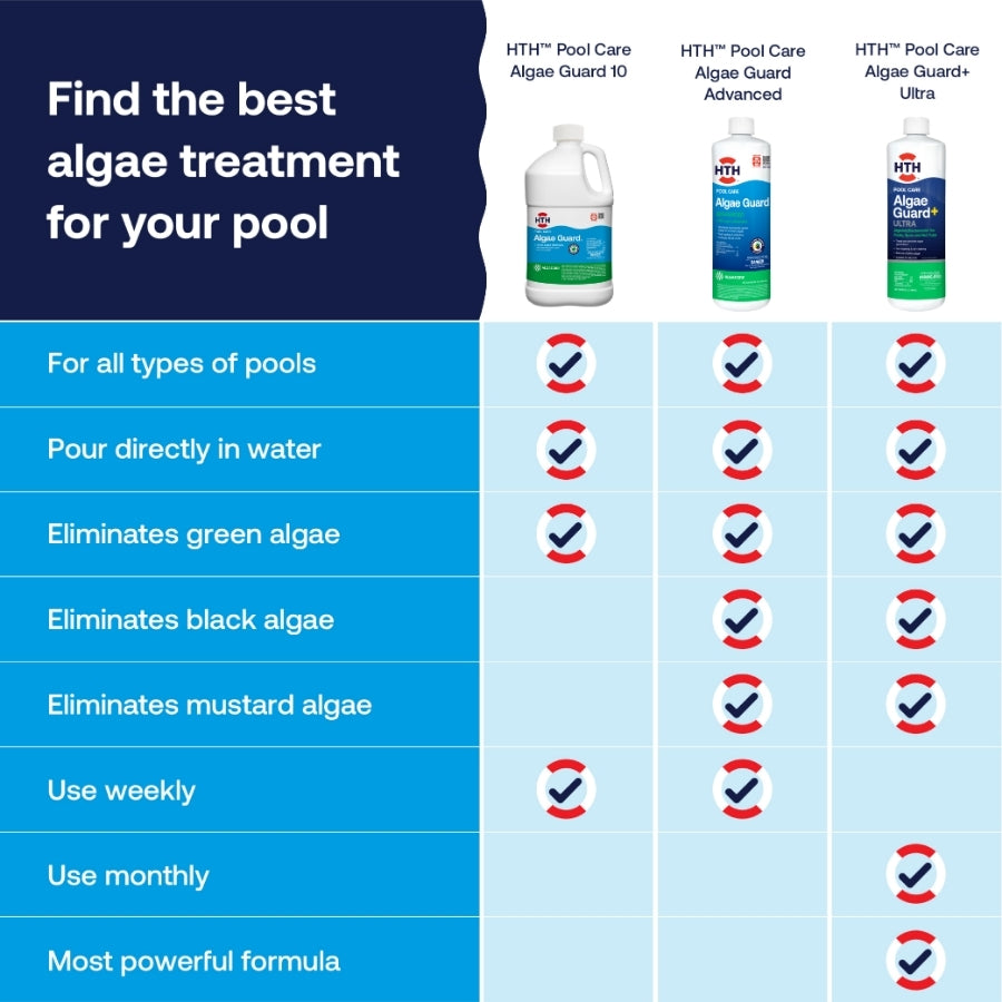 For best results, use HTH™ Algae Guard 10 as part of your weekly maintenance routine. Works great with HTH™ Shock products.