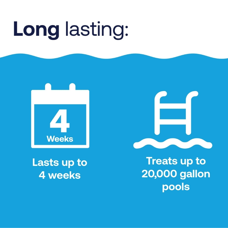 Simply adjust the dial for your pool size and add the floater to your swimming pool. Each pre-filled floater treats up to 20,000 gallons for up to 4 weeks.
