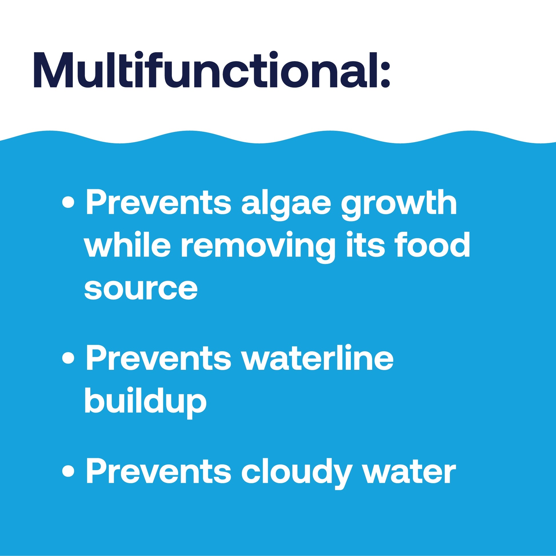 Not only prevents algae, but also contains enzymes and clarifiers to eliminate waterline buildup and maintain crystal clear water.
