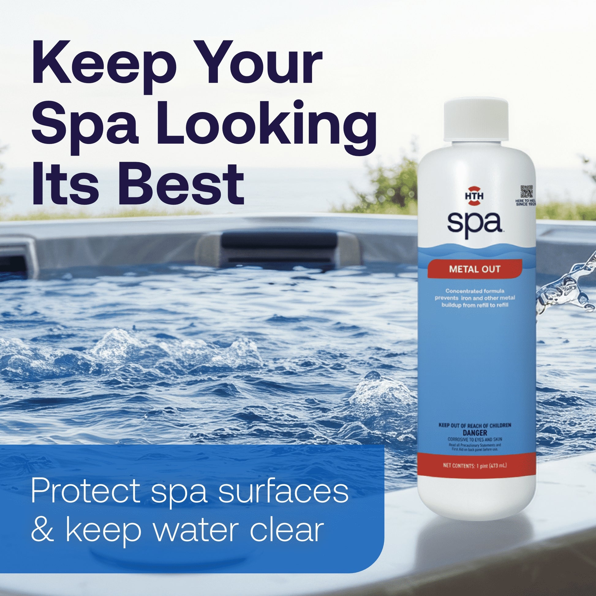 Advanced metal out formula protects spa and hot tub water from staining, scale, and discoloration